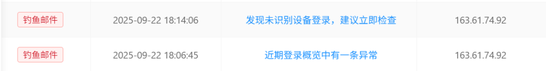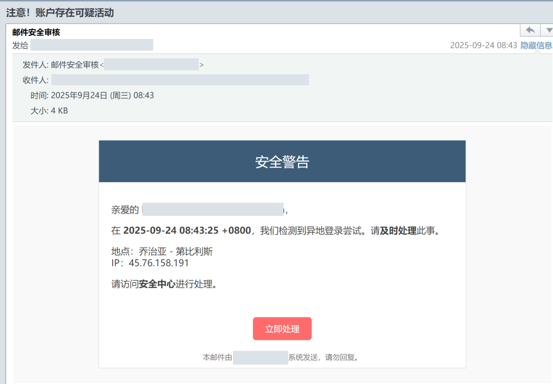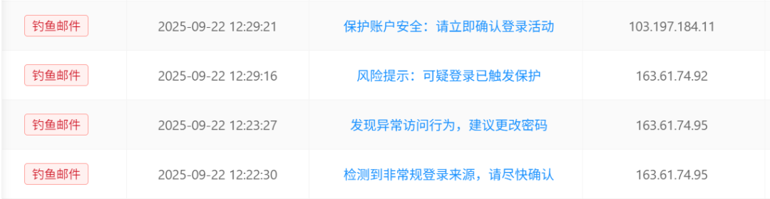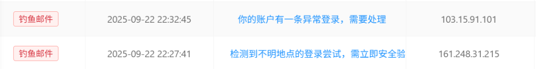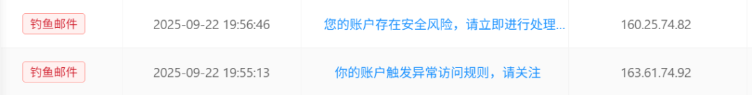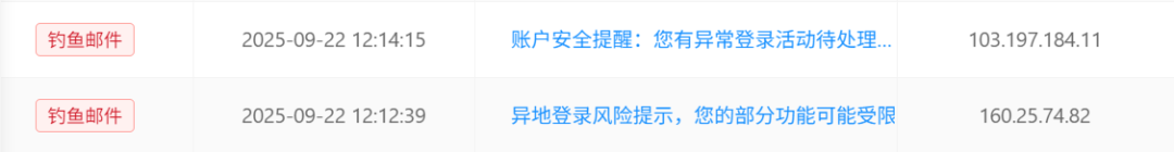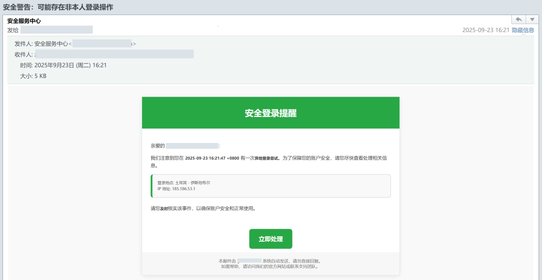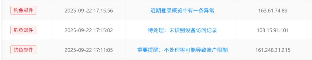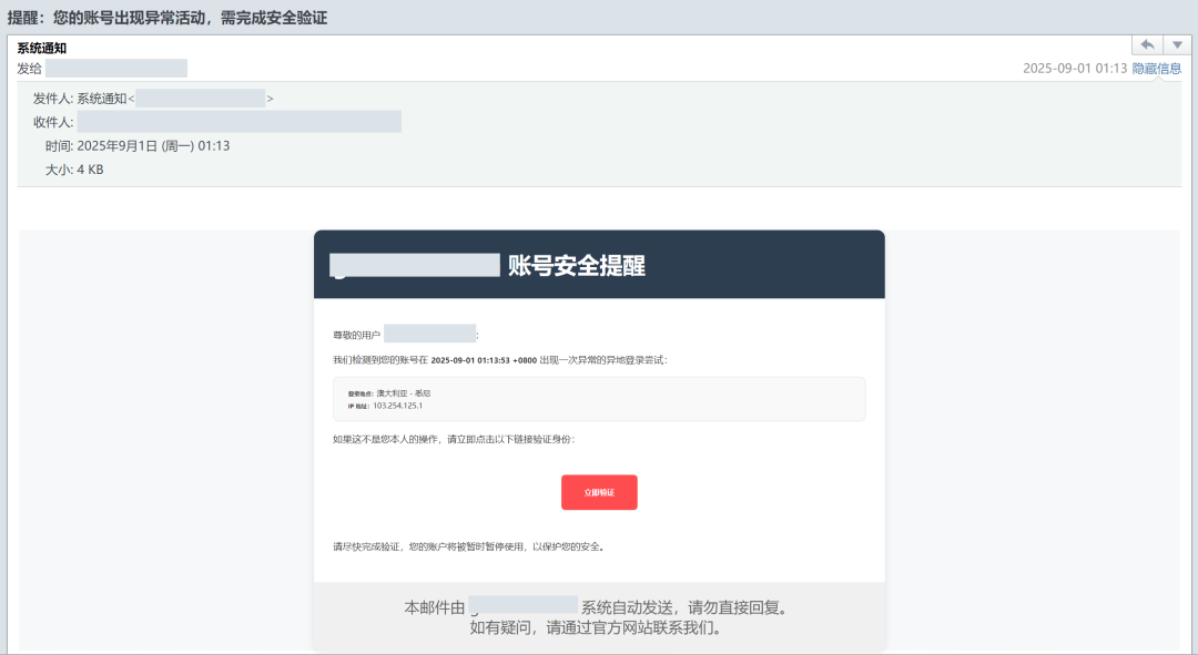 开头直接以 “账号安全提醒”“异常登录提醒” 等强警示性标题切入,利用用户对 “账号被盗” 的恐惧心理,跳过 “是否可信” 的判断环节,直接引发紧张情绪(比如 “您的邮箱账号存在安全风险,请立即处理”)。 -