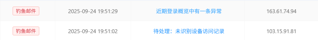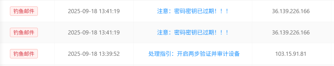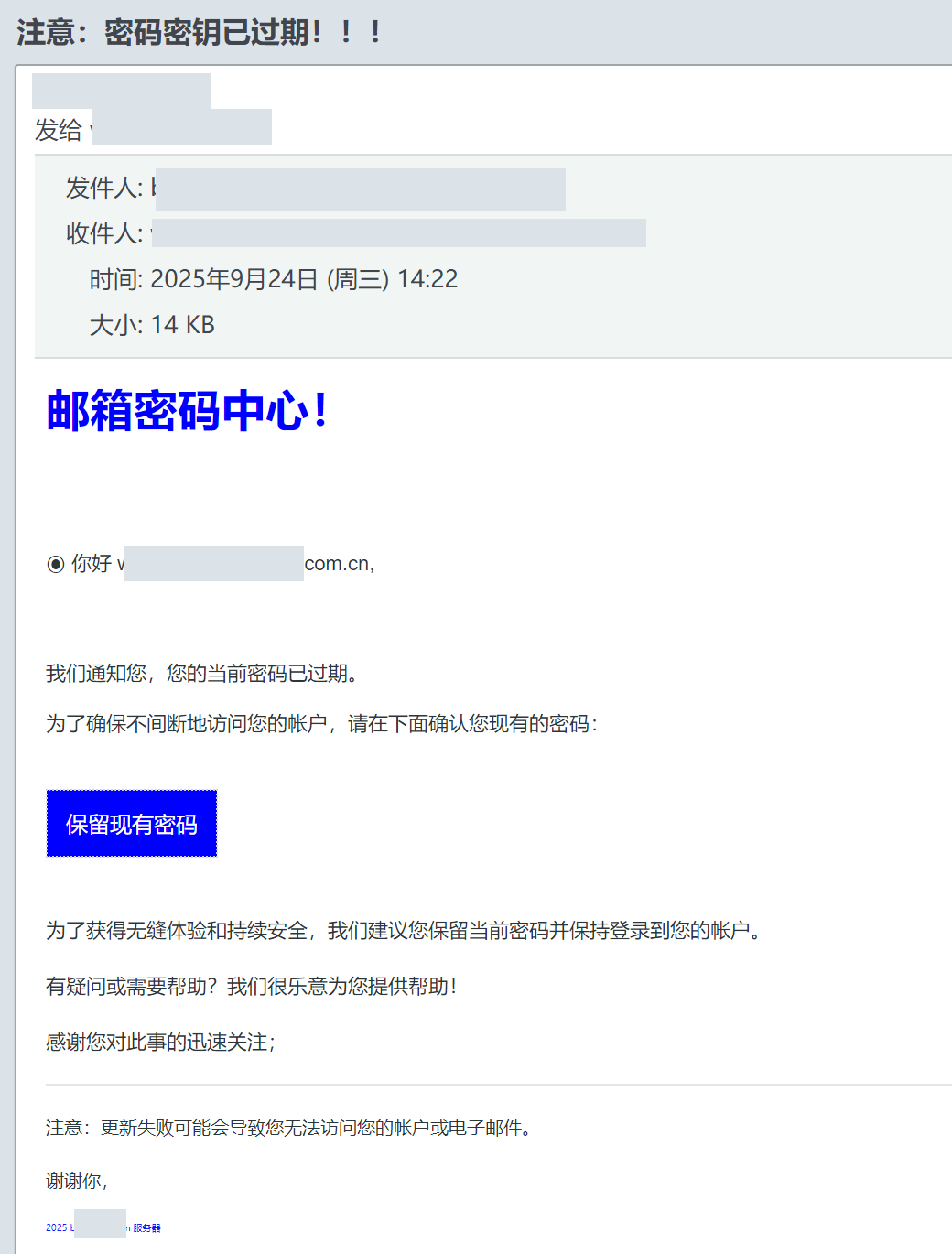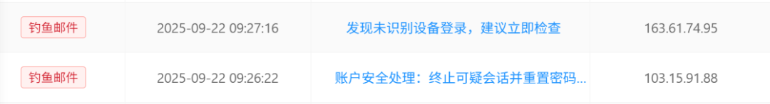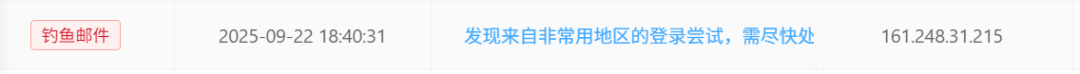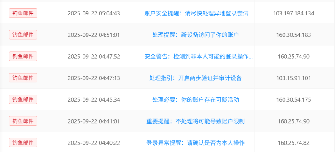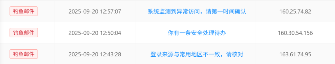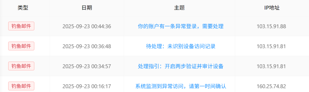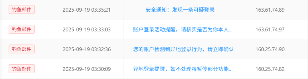 开头直接以 “账号安全提醒”“异常登录提醒” 等强警示性标题切入,利用用户对 “账号被盗” 的恐惧心理,跳过 “是否可信” 的判断环节,直接引发紧张情绪(比如 “您的邮箱账号存在安全风险,请立即处理”)。 -