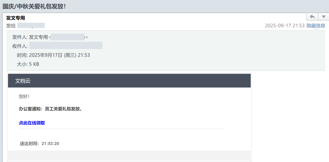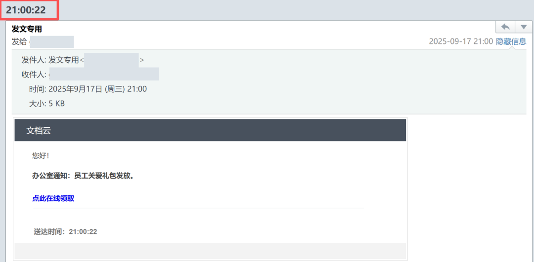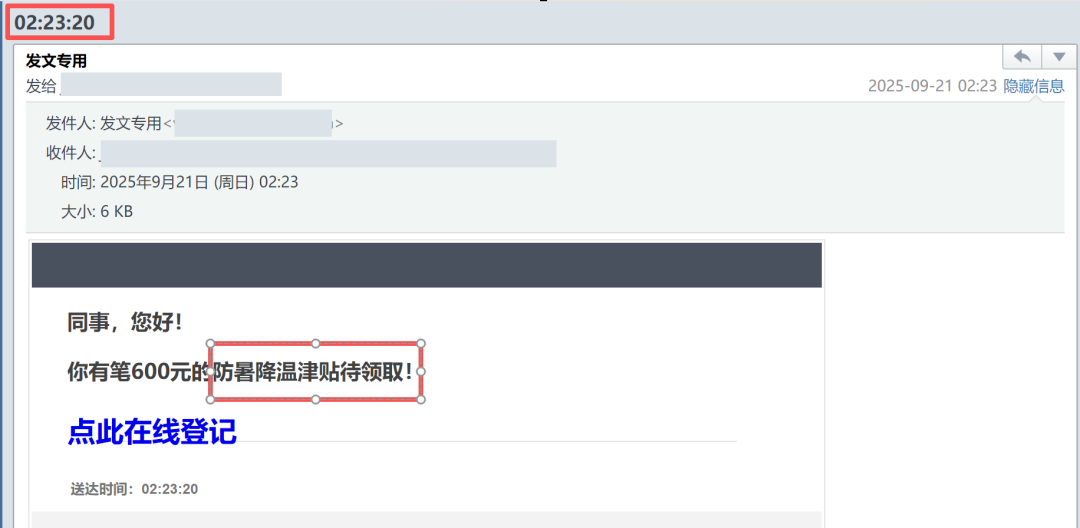 2、同时,攻击者升级规避手段,动态时间、自动回复等伪装技术广泛应用。邮件主题常嵌入实时发送时间,如 “【21:15:03】您的账号登录异常通知”,通过动态变化规避安全网关对固定主题的规则化拦截。更有甚者利用中毒邮箱开通自动回复功能,植入恶意程序后持续扩散,形成连锁攻击,大幅增加防控难度。传统特征检测引擎对此类高对抗攻击检出率不足,需结合智能意图识别与全链条行为分析提升防御能力。