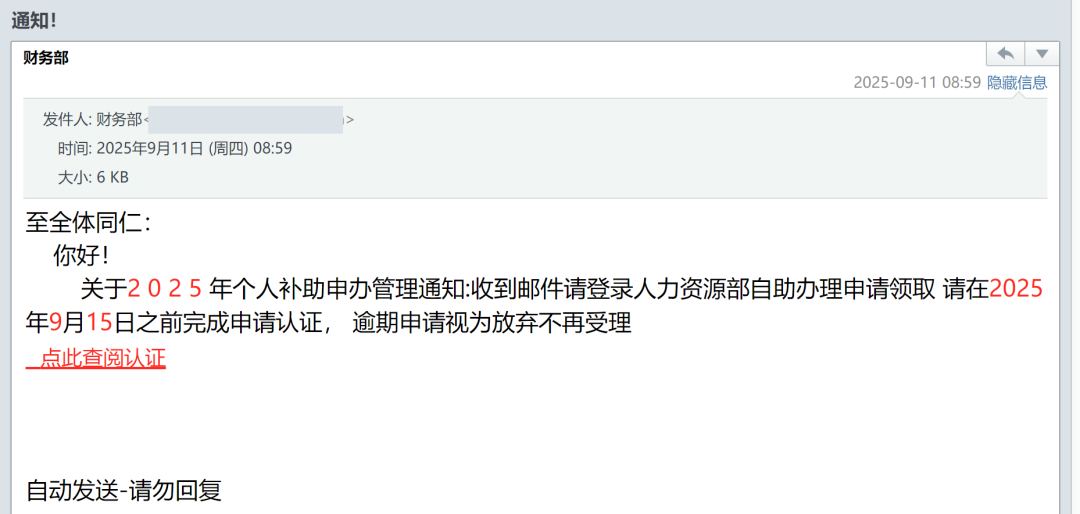 正文结尾会用 “紧急”“立即” 等词汇强化行动必要性,比如 “若不是您本人操作,15 分钟内点击下方链接验证身份,否则账号将被临时冻结”,同时将钓鱼链接包装成 “立即验证”“前往安全中心” 等按钮,掩盖链接的真实地址。