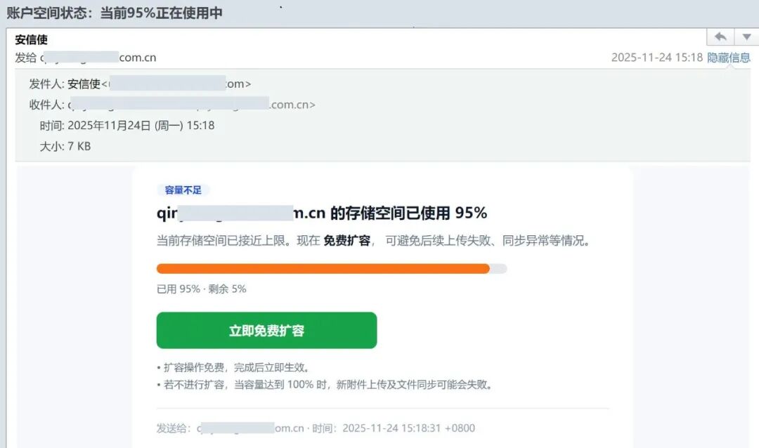 11 月份钓鱼邮件除了延续之前“账号异常”、“申领待办”类热点主题以外,出现了以“存储空间立即扩容”、“银联卡升级”等新型场景主题。