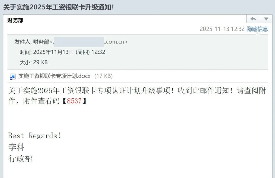 2、正文提供解密密码:邮件正文会直接标注 “查阅密码:XXXX”(XXXX 通常为 4-6 位简单数字或字母组合,如 “202501”“FULI88”),并搭配引导话术,如 “为保护个人信息安全,附件已加密,密码如上,打开后按要求填写申领信息”。这种 “提供密码” 的行为,会让用户误以为是官方的安全措施,进一步信任邮件真实性。