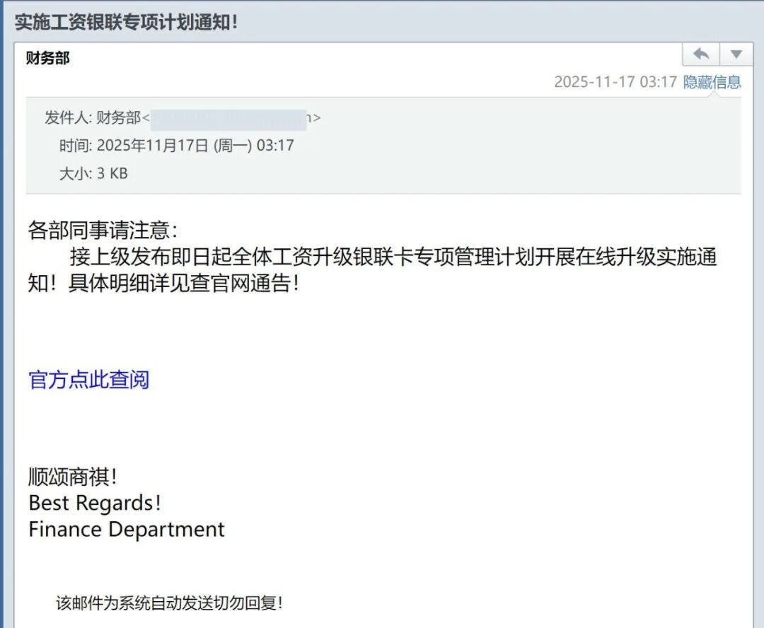 传统钓鱼邮件常直接插入可点击的 URL 链接,易被安全网关识别拦截,而此类邮件采用 “文本化 URL” 的隐藏方式,彻底绕开链接检测机制。